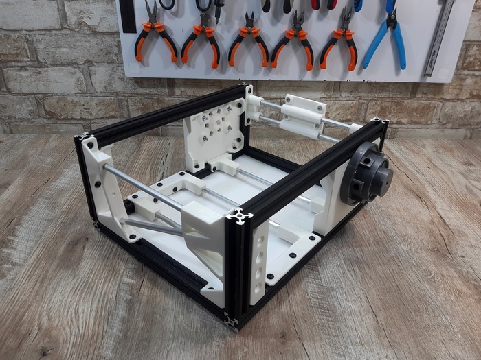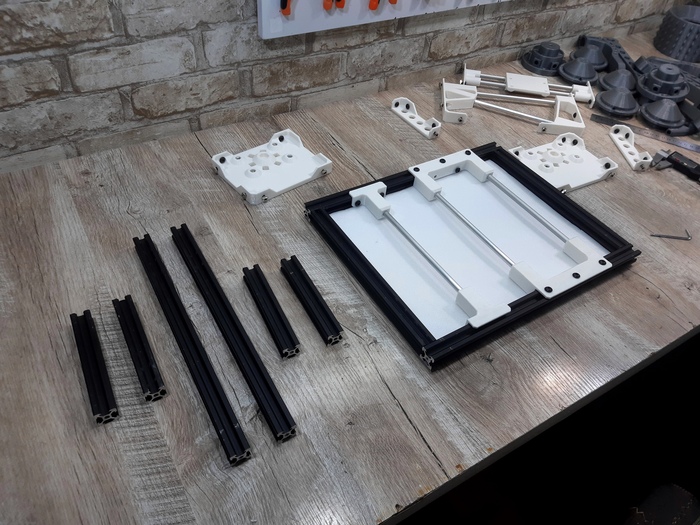 Каркас собрал из алюминиевого конструкционного профиля сечением 20х20 миллиметров, печатных деталей, и 8 мм. алюминиевых трубок (профиля было маловато в наличии).