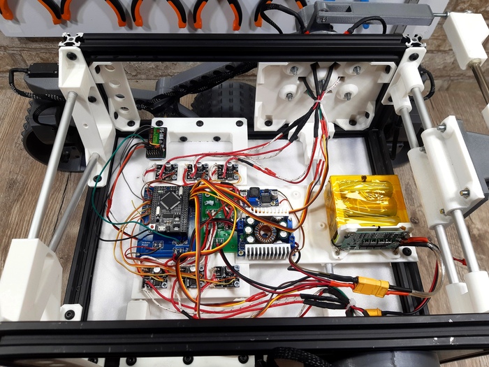Управляется эта штука посредством стандартной аппаратуры управления, приёмник которой подключается к Arduino 2560 PRO по PWM. Мне пришлось самому писать программу управления этой штукой, которая сводится, по большей части, к управлению передними и задними колёсами. И я выбрал именно ШИМ, потому что в отличие от протоколов SBUS, IBUS и прочих, ШИМ поддерживается любой аппаратурой управления.