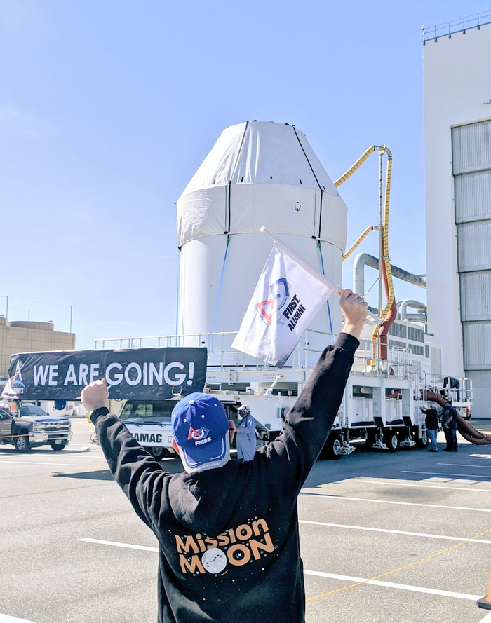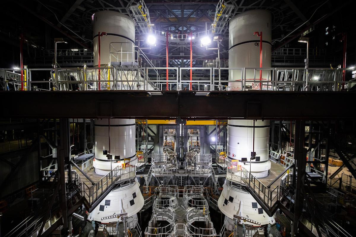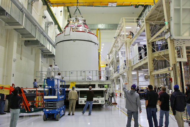 Теперь 1-ю ступень в знаменитом VAB ангаре в Космическом центре им. Кеннеди интегрируют с боковыми ускорителями, 2-й ступенью, а затем и с космическим межпланетным кораблем Orion, который уже был собран и в данный момент транспортируется для финальных приготовлений.