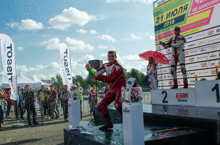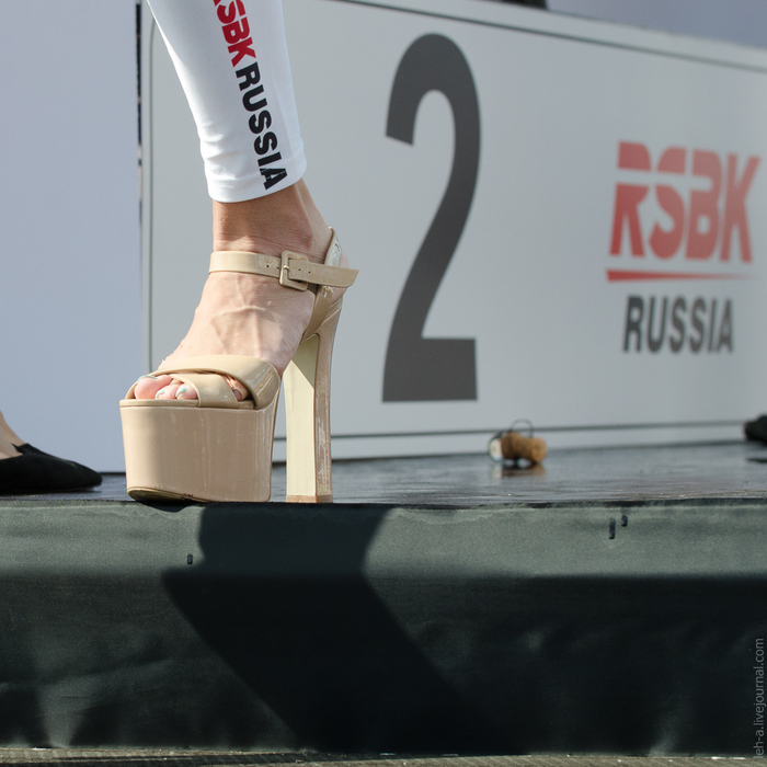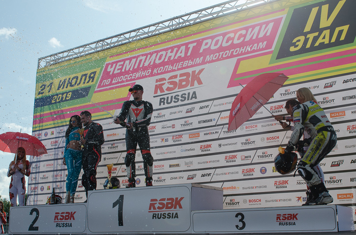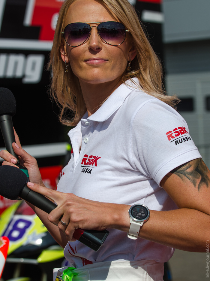 Самой малочисленной и даже немного смешной получилась гонка в классе "Woman" - всего 5 женщин-пилотов ("пилотесс", как выразился ведущий) на треке выглядели очень сиротливо. При этом в гонке Суперспорт Эво (Supersport EVO) наравне с мужчинами выступила барышня - Ольга Шатерникова, которая ещё и на пьедестал взошла. Так что не совсем понимаю целесообразность класса "Woman" как такого в российском Чемпионате: малочисленная медлительная гонка смотрится куда хуже, чем гонка с теми же низкими скоростями, но с большим пелотоном. Распределили бы бедолаг по классам в соответствии с кубатурой и характеристиками байка - мне кажется, что и сами гонщицы были бы рады.