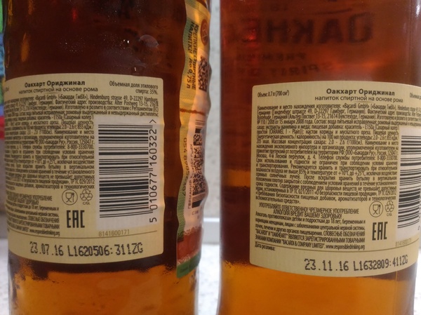 Купил недавно в разных магазинах по бутылке Bacardi Oakheart. Та, что слева быда куплена в "Макси". Вторую приобрёл в "SPAR". Принёс домой и обнаружил, что что-то не так. Есть ли среди них настоящий Bacardi? В интернетах на предмет подделки Oakheart инфы не нашёл