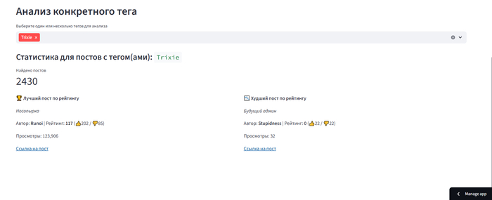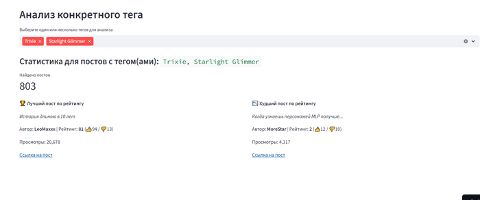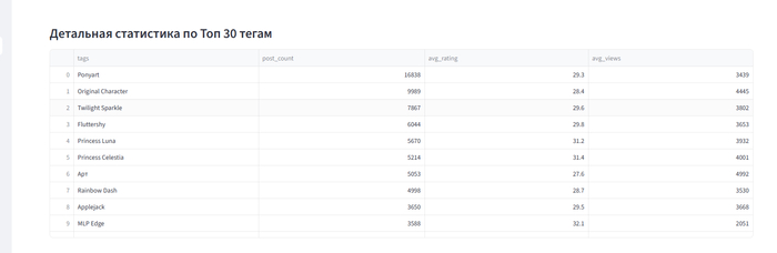 Здесь всё просто, с каким тегом больше всего постов и их средний рейтинг и просмотры.