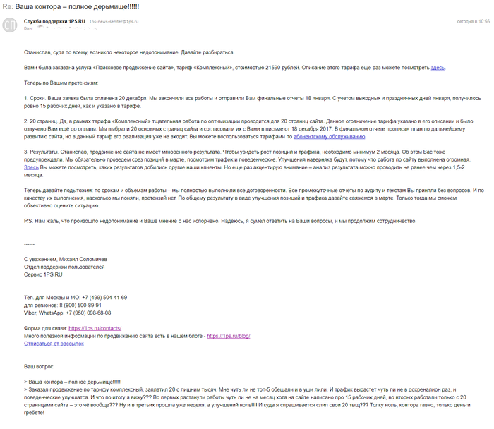 Хотя прочитать, конечно, всё это было интересно - чего уж там))) Как будто узнал чью-то внутреннюю кухню и понял, что косяки бывают у всех, что у всех есть недовольные клиенты и что можно всё же оставаться человеком и регулировать всё более-менее мирным путем. Как-то по-хорошему стало жаль менеджера. Ведь, получается, если письмо получила я, то его не получил какой-то Станислав. Написала в ответку, мол, ошиблись.