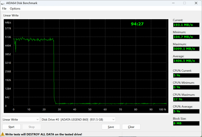 Что это означает? Часть объема прошла через кеш быстро, затем накопитель перешел в более медленный режим. Именно поэтому средняя получилась около 490 МБ/с, а не 900.