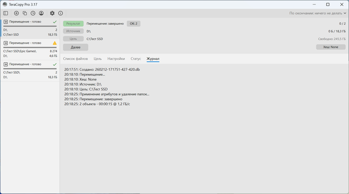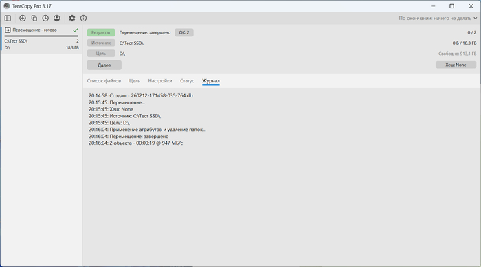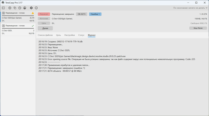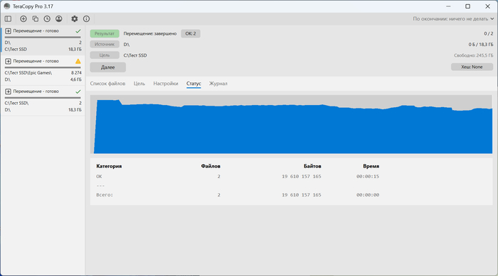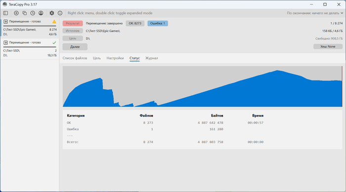 Обратное копирование, с DS72 на NVMe, заняло 2 минуты 43 секунды при средней скорости около 412 МБ/с. Чтение предсказуемо стабильнее записи, но до синтетических 1000 МБ/с в реальном сценарии дело не доходит.