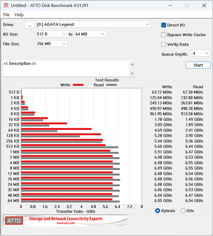 ATTO показывает ровный выход на 980–1000 МБ/с начиная примерно с блока 256 КБ. Интерфейс используется почти полностью, без странных провалов.