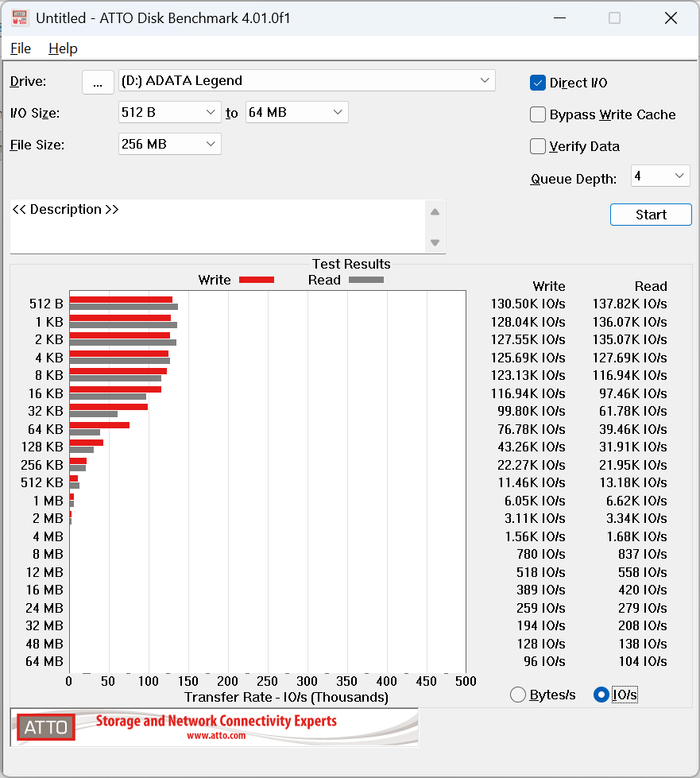 По случайным операциям на глубокой очереди – около 60–64 тысяч IOPS. Для компактного USB-накопителя это нормально. В Q1T1 цифры ощутимо ниже, и это заметно в сценариях с большим количеством мелких файлов.