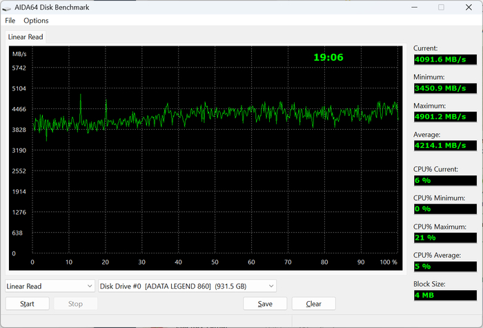 График ровный, без ступенек. Чтение стабильно по всему объему. Даже при длительной нагрузке накопитель не начинает «плавать».