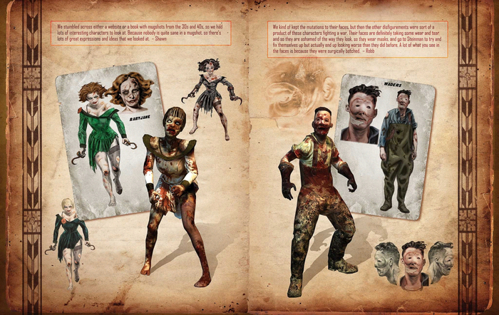 Дальнейшим элементом, на который ушло много работы, оказались сплайсеры – мутировавшие местные жители Восторга. В Irrational Games долго не могли решить, как же они должны выглядеть и настолько напоминать людей. В итоге дизайнерам идею подкинул Кен Левин, предложившийся в качестве референсов изображения “Проекта Фасад”. Если кратко – это были ранние попытки в пластическую хирургию для ветеранов и жертв Первой Мировой войны, чьи лица серьезно пострадали от осколков и прочих повреждений. Выглядит хоть и функционально, но смотреть на результаты работы жутко и некомфортно. Зато подобные изображения очень помогли художникам в создании безумных маньяков-наркоманов, с которыми нам приходится воевать.