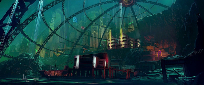 Подводный город был эпической мечтой, а потому должен был выглядеть ярко и помпезно. Лучшего варианта, чем завернуть это всё в архитектурный стиль ар-деко, придумать было сложно. Золото, колонны, некая театральность – всё это обещало жителям Восторга успешность и величие. Однако все мы понимаем, что подобная утопия невозможна, а потому и весь город выглядит так, будто ему суждено было пасть.