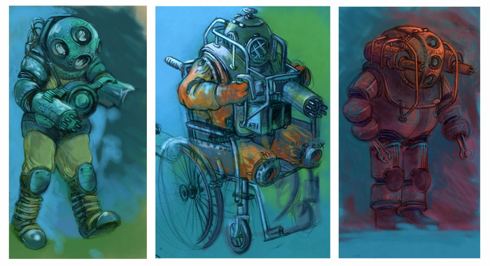 Можно сказать, что наиболее чётким вышло создание Больших папочек. Образ огромных монстров в костюме подводника, защищавших Сборщиков, сразу понравился всем в студии. Внешний вид оказался и мощных, и органичным для мира игры. Разумеется, визуальный стиль костюма полировали, но от начальной концепции далеко не отходили.