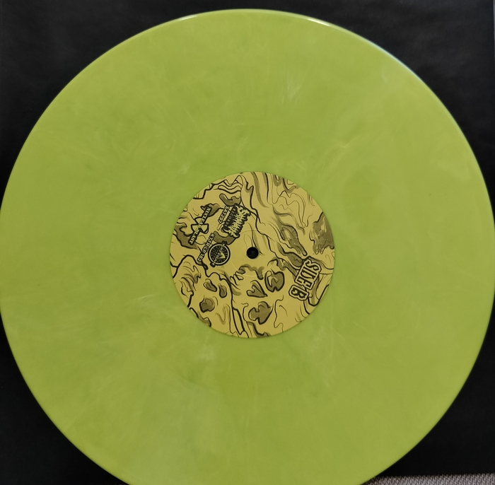 Сам винил цветной, выполнен в кислотно зелёном цвете с подтеками совсем уж кислотного цвета
