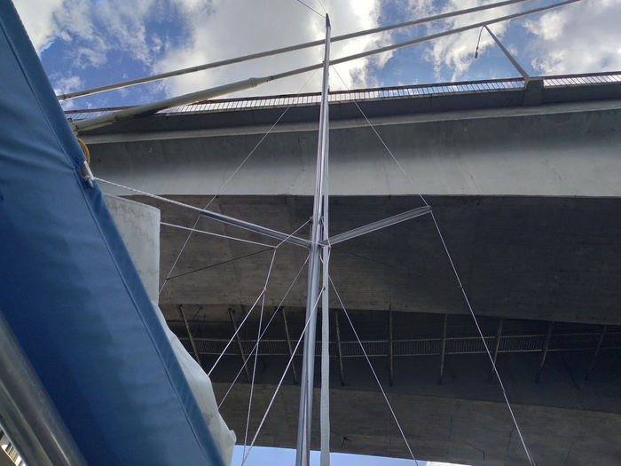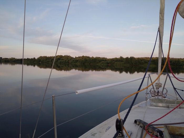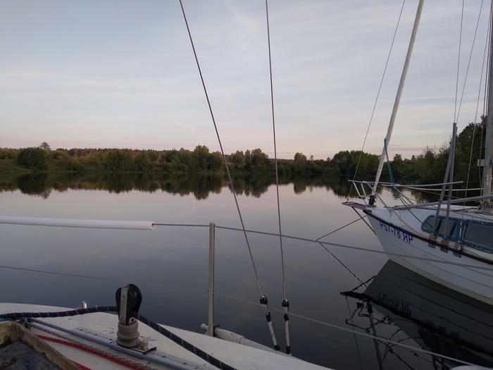 Выдвинулись в 7:45. Ветра совсем нет. Под стрекот моторов проходим Дубну. Удивительно, сколько старых советских моторок на лодочных стоянках, причем в основной массе это «Казанки», и многие даже без булей. Пройдя под новым мостом, подходим к шлюзу. На запрос возможности прошлюзоваться получаем ответ от диспетчера - ждите, проводятся водолазные работы. Ничего не поделаешь, болтаемся напротив ГЭС, смотрим за тренировками воднолыжников. От скуки меня потянуло на кулинарные подвиги - сварил суп из рыбных консервов.