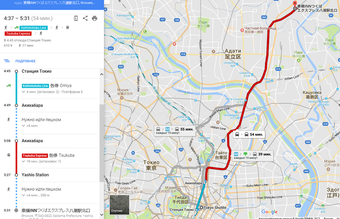 Когда бронировал отели, я хотел 7 дней провести в Киото и 7 дней в Токио. Однако самый дешёвый на то время отель был только на 6 дней. В Токио я хотел попробовать пожить в рёкане - гостинице в традиционном японском стиле. Отзывы мне о них понравились, да и стоят дешевле отелей. Но в датах была не состыковка, поэтому пришлось ещё забронировать транзитный отель в Ясио (недалеко от Токио) на одну ночь. Вернувшись в номер проложил в гугле маршрут до отеля Toyoko Inn Tsukuba Express Yashio-eki Kita-guchi. Мне уже приходилось в Фукуоке останавливаться в Тоёко, там были маленькие тесные номера, в половине которых окна были впритык к стене, но для меня это был самый приемлемый вариант.