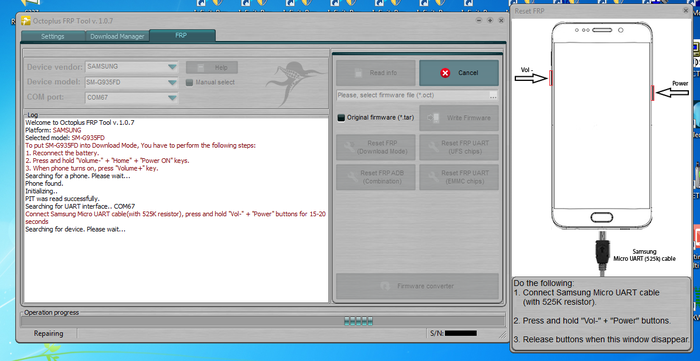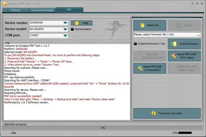 Запускаем Octoplus FRP Tool, выбираем модель телефона и COM порт бокса. Жмём Reset FRP UART(UFS chips).