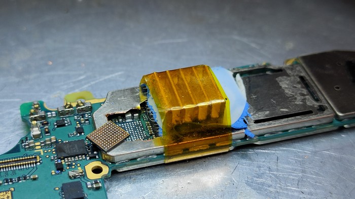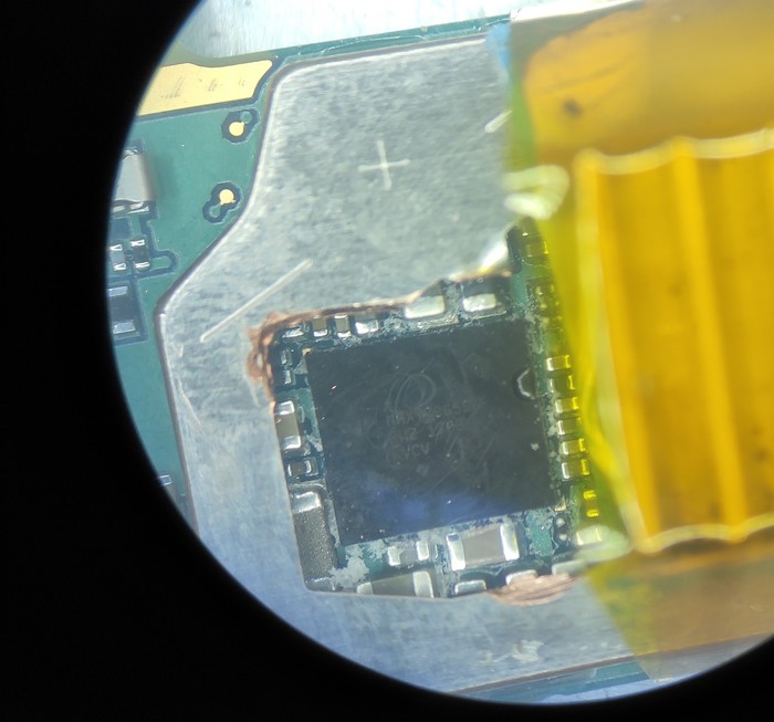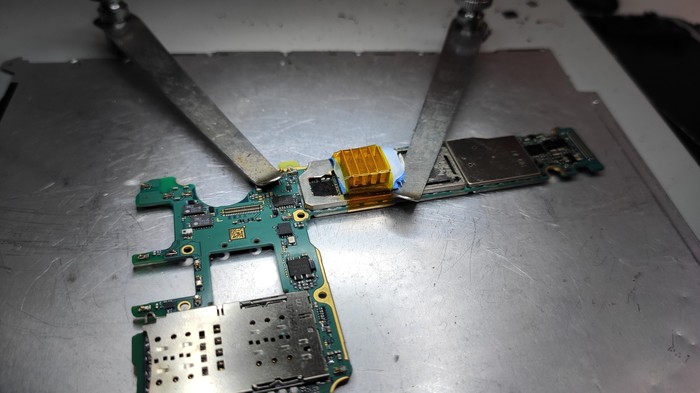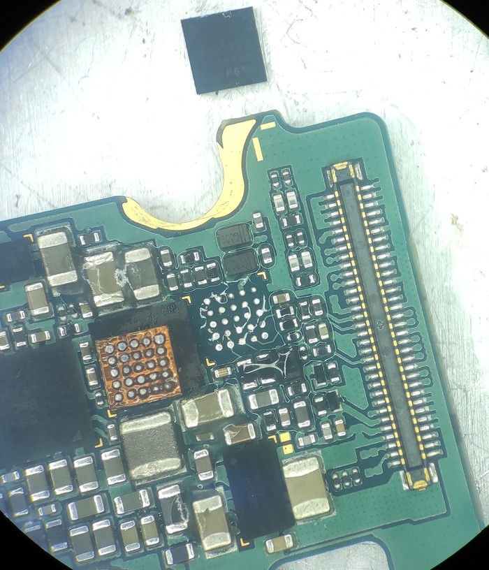 Снимаю пробитую микросхему и подготавливаю к установке другую, снятую с донора: