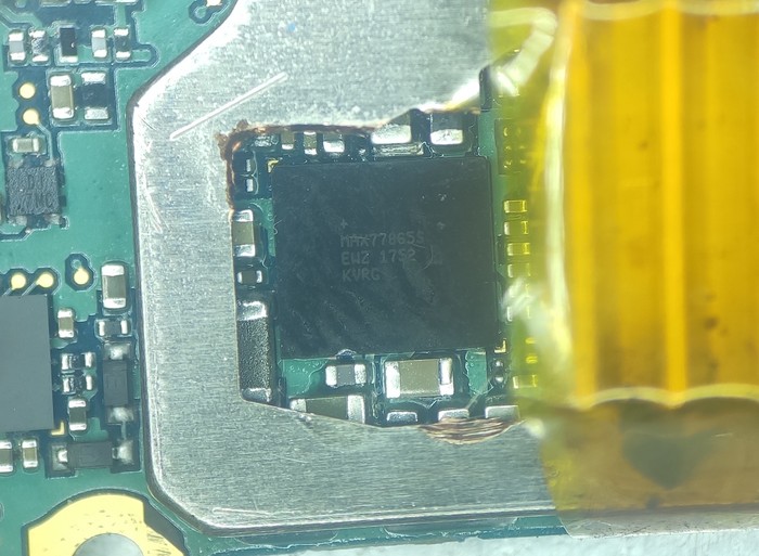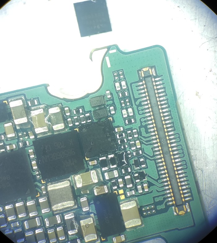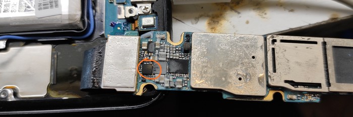 Замораживаю низ платы, подключаю телефон к зарядке без аккумулятора и вот ещё один виновник - первый разморозился от аномального нагрева: