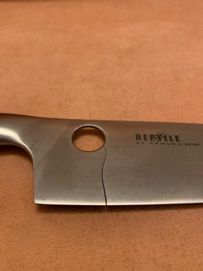 Здравствуйте. Прошло менее 3 месяцев пользования. Нож треснул. Фото во вложенных файлах. Как вы поступаете в подобных ситуациях?