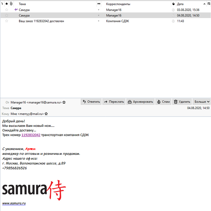 Следующим сообщением было: Мы высылаем Вам новый нож… Ожидайте доставку… Трек номер ********** транспортная компания *****.