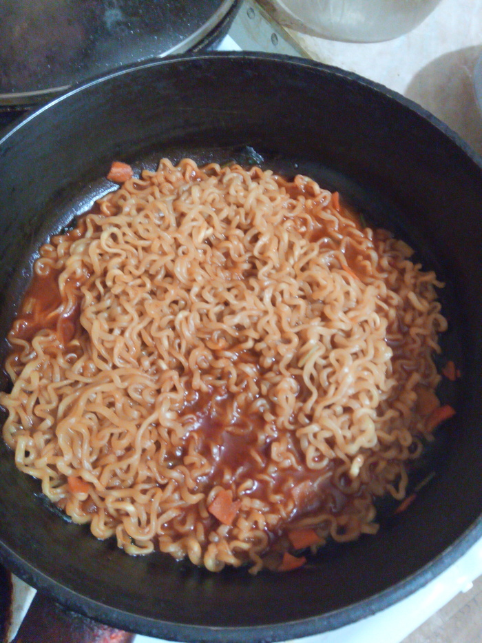 Лапша была сварена и съедена. По итогу могу сказать, что острота всё же присутствует, по классической шкале - где-то около 2.5 доширов (сугубо субъективно) . Отсутствие овощей все же сказывается на вкус - бедноват, местами просто вкус перца. Но сама лапша - весьма достойная. В итоге можно оценить на 3+. Но что-то меня зацепило в этой лапше, и я начал над ней экспериментировать. И итогом этих экспериментов стал этот рецепт: