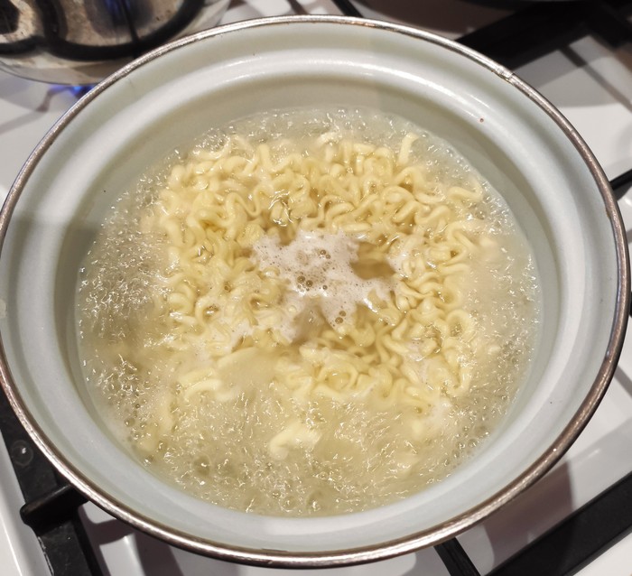1) Начало как по инструкции - вскипятить 550мл воды, положить туда лапшу и высыпать содержимое пакетика. Засечь время. Варить периодически вынимая на поверхность лапшу - это насыщает её воздухом, делая лапшу упругой и не даёт ей развариться.