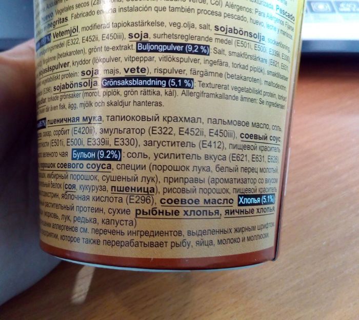 4. Состав, в котором заявлено наличие рыбы и яиц в виде хлопьев.
