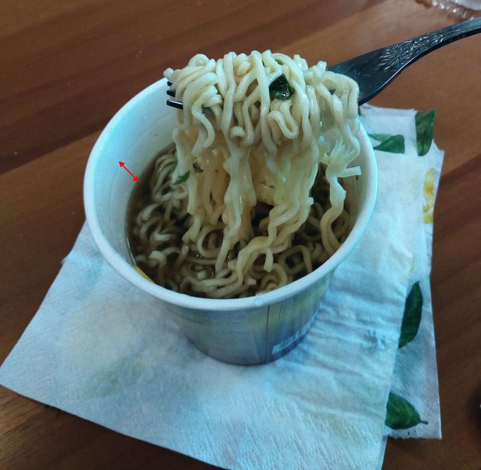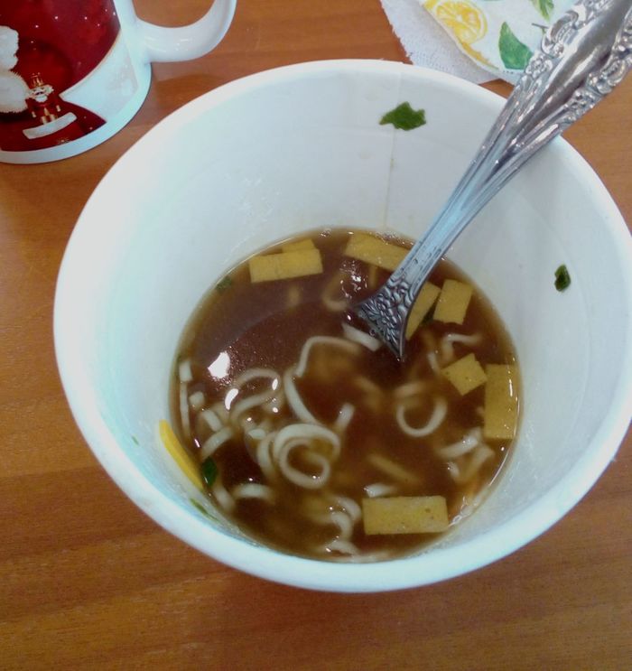 8. Лапша впитала воды совсем немного, при этом очень размягчилась, потеряв плотность. К тому же, видимо, из-за большого объема воды (хотя и по инструкции - до верхней линии) бульон получился пресным. Отсюда вывод: воды нужно заливать меньше, если мы хотим получить более-менее нормальную лапшу, а не жижу в воде.
