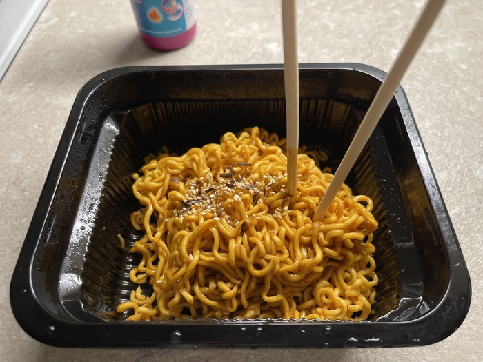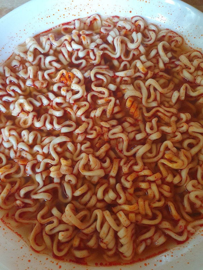 UPD: К сожалению смогла осилить только 3/4 порции. И еще.. холодное молоко усиливает жжение. Почему так я хз. Спустя 30 минут после поедания лапши рот все еще горит. Пожелайте мне удачи :)