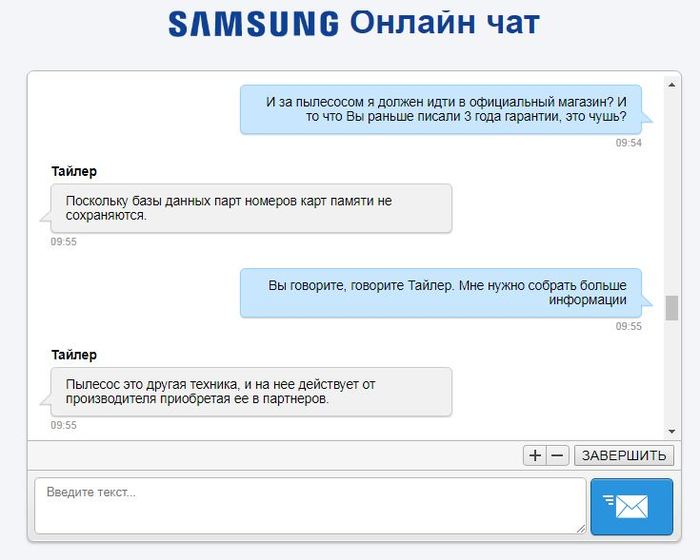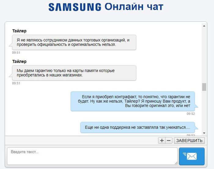 Вывод №2: Покупая карту памяти Самсунг в простом магазине, вам придется доказывать, что вы не верблюд. Доказывать, что продавец не имеет права устанавливать срок гарантии ниже, чем это сделал производитель. Стать полноценным юристом. Обратиться в Роспотребнадзор, в суд. И при всем при этом Самсунг будет вам отвечать: "К сожалению, ничем помочь не можем, идите..."