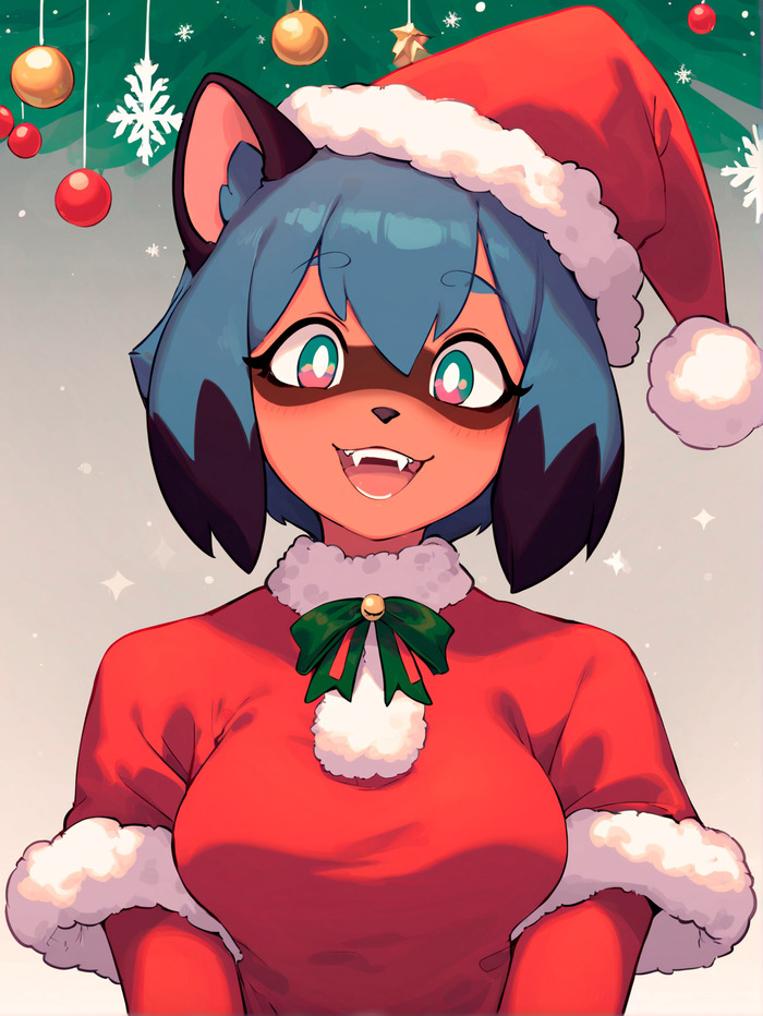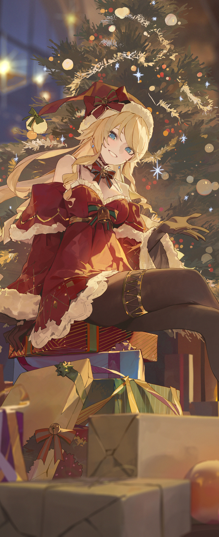Волшебная аниме-девушка в костюме Санты с ушками эльфа несёт праздничное настроение. Золотые волосы, милая улыбка и жест "победа".