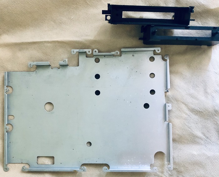 Представляет из себя моноблок, состоящий из поддона, верхней крышки с клавиатурой (весит около 4х кг). Два серых прямоугольника - это шторки, которые закрывают разъёмы картриджей.