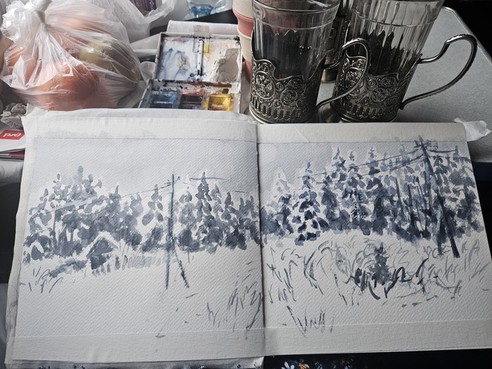 А сейчас хочу показать вам зимнюю метель из своего скетчбука. Я обожаю поезда, звук колес, мимо проносятся живописные виды, за окном развернулась настоящая зимняя сказка. Без лишних раздумий и подготовки я запечатлела это состояние. ❄️