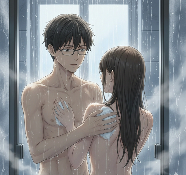 В душевой она включила воду, и через мгновение на нас обрушились тёплые струи. Она сразу прижалась ко мне, мокрая и скользкая, и от неожиданности я вздрогнул. Её руки обвили мои плечи, пальцы вцепились в спину. Моя кожа под её ладонями взбунтовалась — пробежали мурашки, хотя вода была почти горячей. Мысль «я стою голый под душем с голой девушкой» вызвало у меня прилив смущения и острого, непрошеного возбуждения.