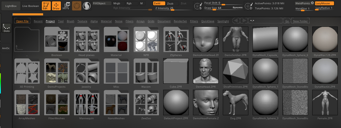 Помимо домашней страниц, при каждом запуске у вас будет открываться LightBox — окно с папками, в которых находятся кисти, материалы, меши и другие элементы программы. Вы вряд ли будете использовать его каждый раз, поэтому запуск можно отключить. Для этого вверху программы выберите Preferences → LightBox и нажмите Open At Launch, чтобы кнопка перестала гореть.