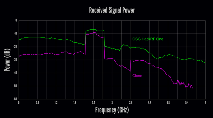 Даже на этой небольшой выборке из 2-х наших плат, 2-х китайских и наложенными данными оригинальной платы GSG Hack RF One видно, что китайские платы ведут себя по-разному - одна ведет себя неплохо, а вторая в диапазоне частот до 2,3 ГГц на 10 дБ хуже по чувствительности, в диапазоне 2,7 ГГц и выше ведет себя получше (чувствительность хуже в диапазоне 0...5...7 дБ), но тоже хуже оригинальной платы и плат нашего производства. Платы нашего производства ведут себя не хуже оригинальной (в рамках наложения).