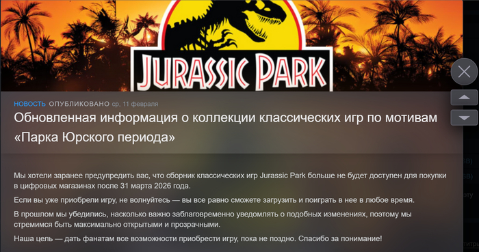 31 марта Jurassic Park Classic Games Collection уберут из продажи и возможно это последняя скидка...