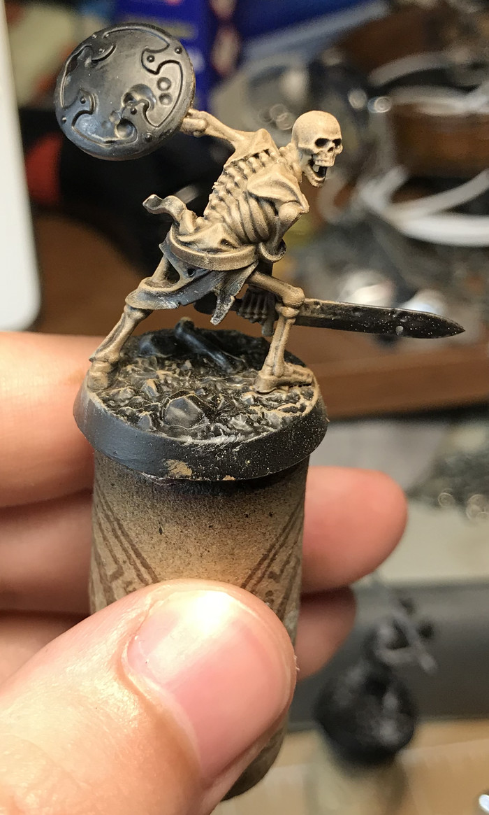 Итак, наши скелеты собраны, зачищены и загрунтованы в черный. Рекомендую красить кости в первую очередь, так как этот процесс весьма грязный, и, наверняка, вы заденете другие части миниатюры. Основная техника на сегодня - drybrush (сухая кисть). Ликуйте, новички ;)