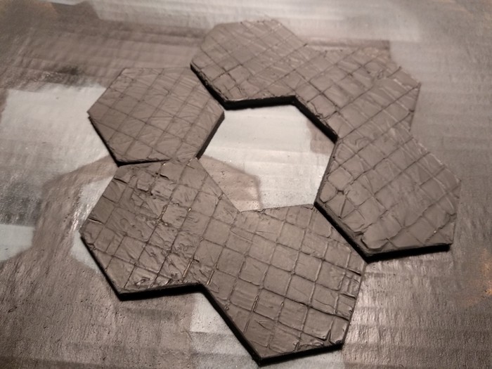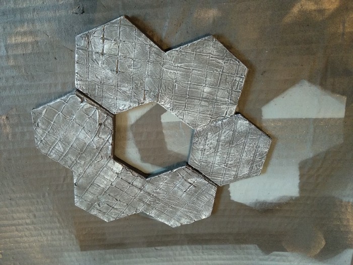 Нанес шпатлёвку по дереву и придавил ячеистым шаблоном для создания текстуры брусчатки.