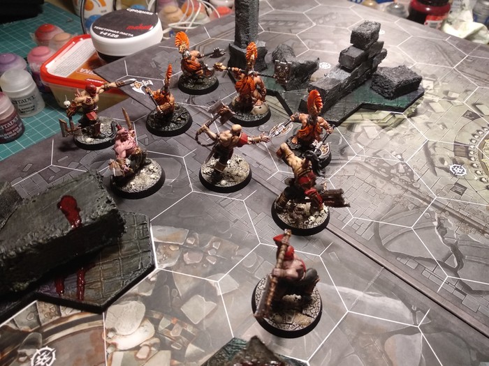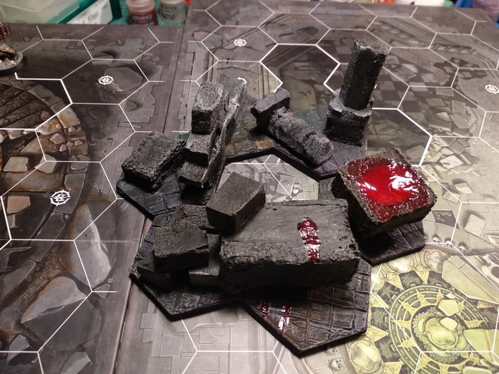 Из подручного материала (остатки упаковки и листовой утеплитель) нарезал колонн, блоков для стен, жертвенный алтарь и чашу под кровищу. Загрунтовал, прямо по грунту драйбраш с проливками. Кровь лил готовую цитаделевскую.