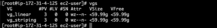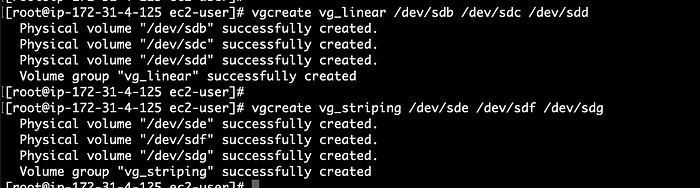 # vgcreate vg_striping /dev/sde /dev/sdf /dev/sdg