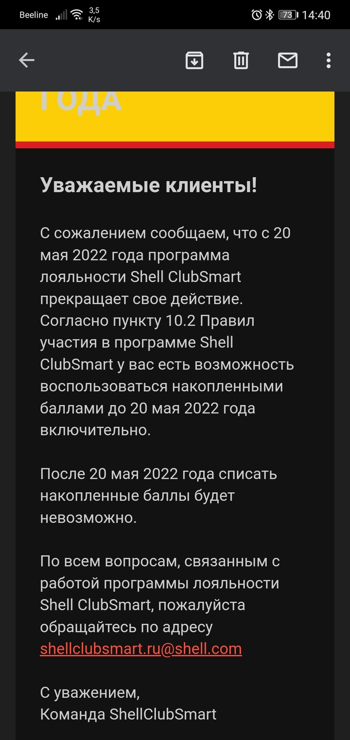 На сайте компании сказано, что с 20 мая 2022 года программа лояльности Shell ClubSmart прекращает свое действие — воспользоваться накопленными баллами клиенты смогут до 20 мая 2022 года.