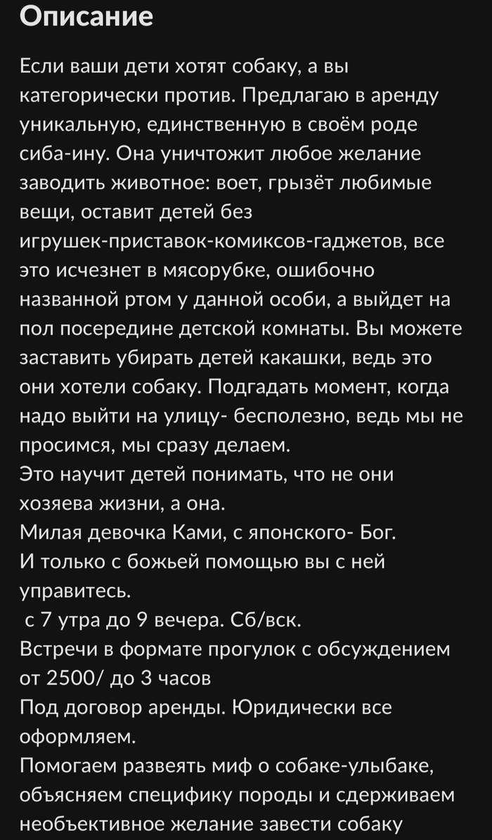Внезапно, среди запчастей на мой автомобиль, спальных мешков и электромоторов, попалось такое на Авито. Барышня (хозяйка собаки) знает толк в маркетинге: