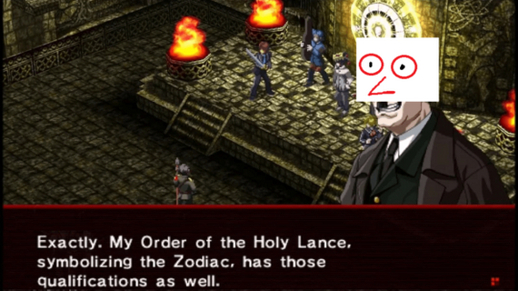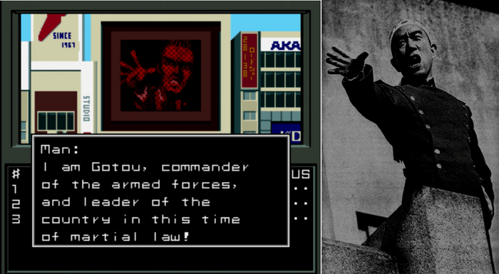 К примеру, сцена из самого начала игры, где вы столкнетесь с первым серьезным выбором, который повлияет на ваш alignment. Вы поочередно поговорите с Торманом – послом США и представителем Сил Самообороны Японии – Гото. Образ генерала взят с реально существовавшего и несколько раз номнировавшегося на Нобелевскую премию по литературе Юкио Мисимы (урожденный Кимитакэ Хираока).