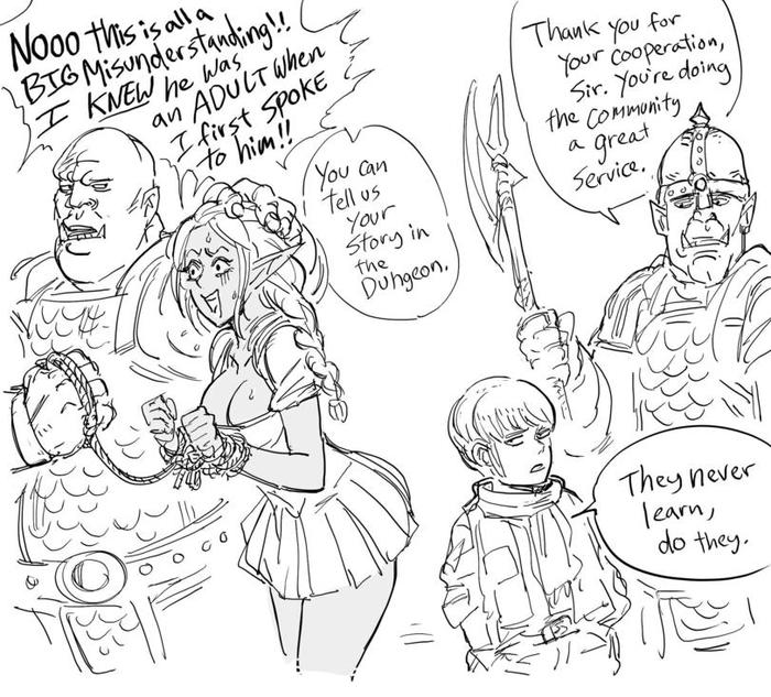 -Эй, мальчик.Тебе одиноко? Хочешь поиграть со старшей сестренкой дроу? Подойди и зацени мою грудь, у меня там лежат конфеты и карточки для обмена(типа гвинта)!