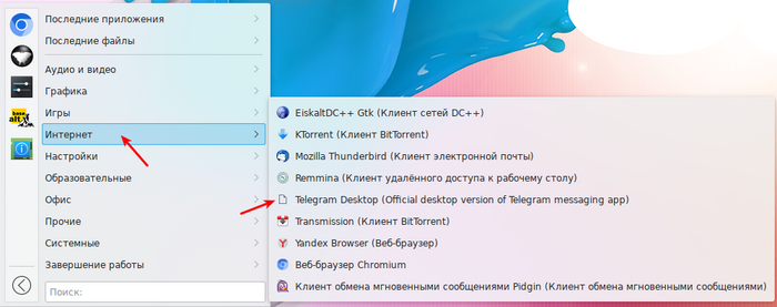 Откроем меню Интернет и там увидим новый пункт Telegram Desktop запустим:
