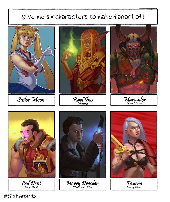 Сегодня закончил рисовать на челлендж SixFanartsChallenge. Суть челленджа проста - люди дают тебе имена шести персонажей, которых тебе нужно нарисовать.
