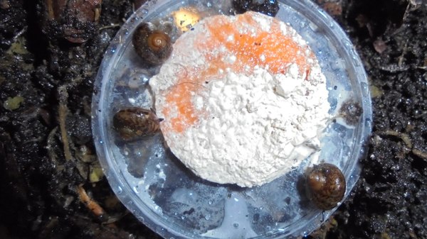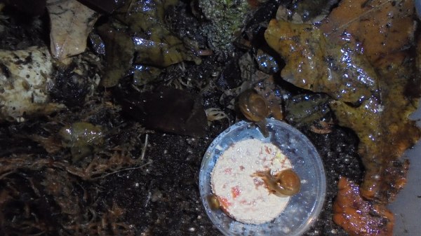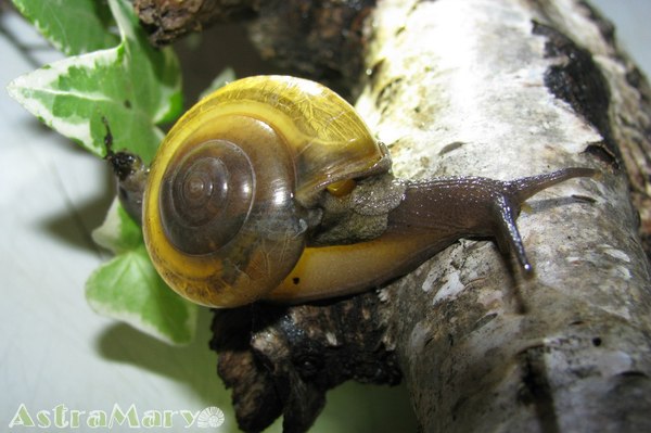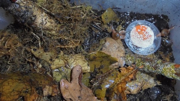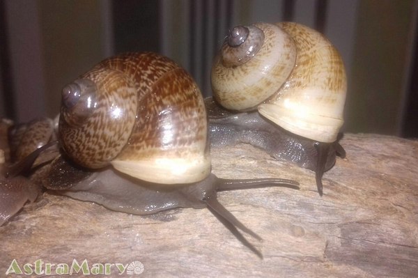 Живут они в контейнере на 30 литров, хотя и пишут, что на одну надо 5-7 литров. Грунтом, как и у всех наших зверей, служит верховой нейтрализованный торф. Влажность поддерживается каждодневным опрыскиванием. Кальций в свободном доступе, белковые подкормки понемногу при каждом кормлении. Едят все, что предлагала: тыкву, грибы, яблоко, салат. И съедают все под чистую, чем очень нас радуют. Самое интересное в этих улитках то, что в отличии от большинства моллюсков они не откладывают яиц, а являются живородящими. На свет появляются уже сформировавшиеся самостоятельные маленькие улиточки. Естественно хочется увидеть весь процесс родов собственными глазами и поухаживать за малышами. И все впереди :).