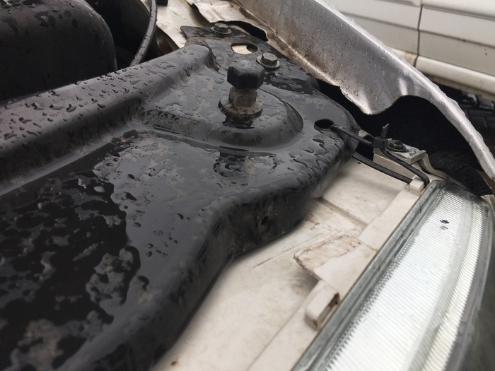 Открываю капот и сразу первое что бросается в глаза угадайте что? Взгляните на фото еще раз с левой стороны наверняка уже заметили болт крепления крыла стоит не по центровке? Присматриваюсь более внимательно, нет все отлично болты никто не трогал они родные. Просто это сборка НАША РАША и так сойдет. Хотя учитывая что все элементы в родной краске и не снимались на такие мелочи можно и не обращать внимание.