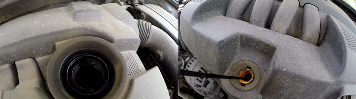 А вот тут я конечно немного приуныл. Взгляните на щуп масляный, а точнее на то что весь в нагаре. Далее смотрим на заливную горловину и там картина не лучше. Масло явно не самого лучшего качества и двигателю это явно не на пользу.