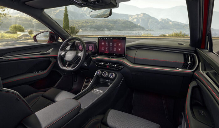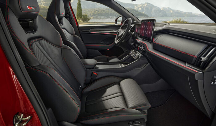 В салоне Skoda Kodiaq RS появились спортивные передние кресла с интегрированными подголовниками и электроприводом, трехспицевый руль и легкий красный декор, который добавляет нотку роскоши. Пересмотрена графика виртуальных приборов, что делает салон более современным и удобным для водителя.